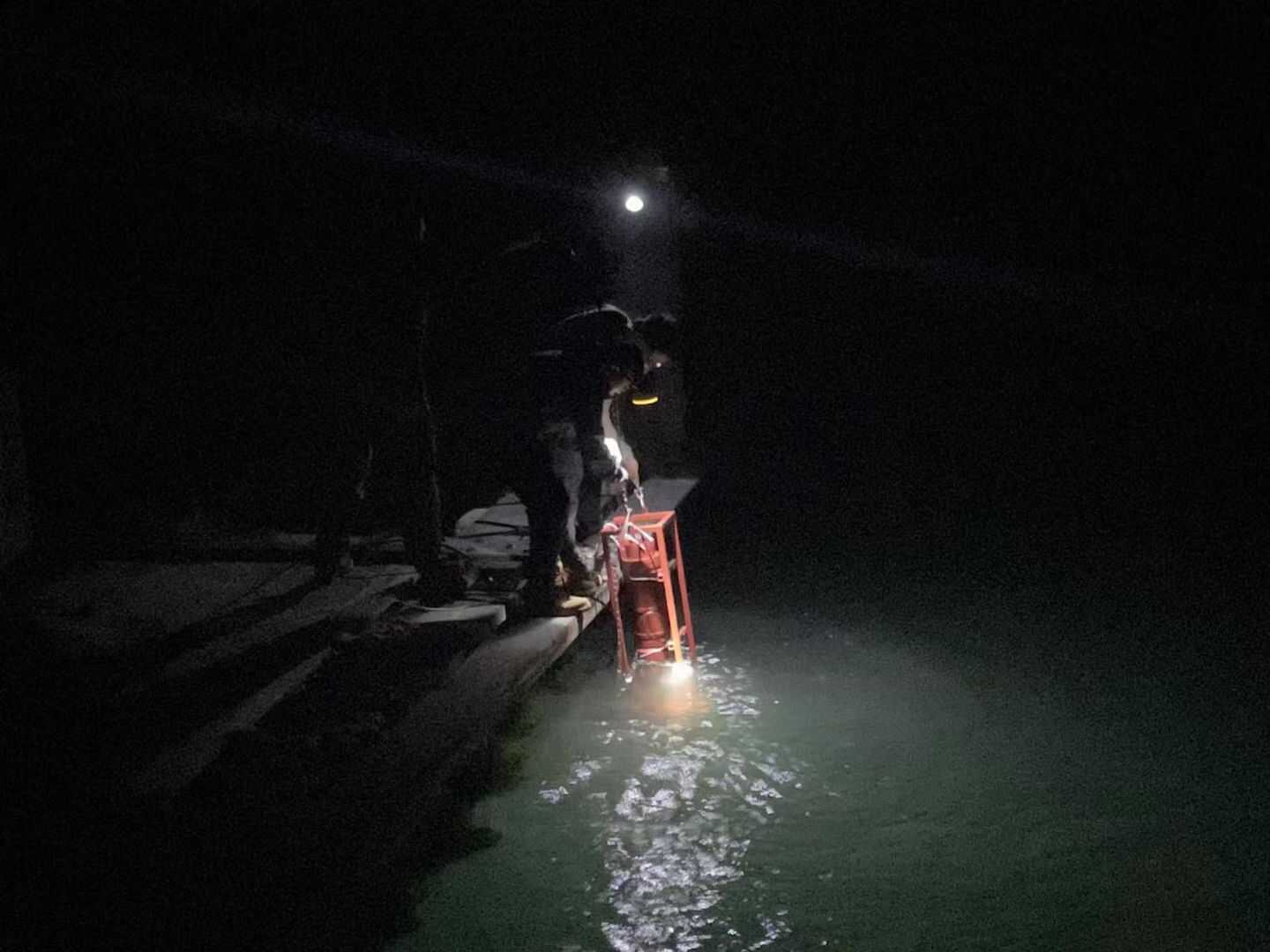 李劍平在海上浮排工作到深夜 ,測試部署浮游生物原位成像儀