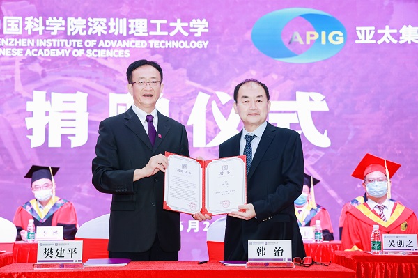 儀式上, 中科院深理工籌備辦主任、深圳先進(jìn)院院長(zhǎng)樊建平與深圳亞太控股集團(tuán)有限公司董事長(zhǎng)韓治代表雙方簽署捐贈(zèng)協(xié)議。樊建平向韓治先生頒發(fā)捐贈(zèng)證書,韓治先生同時(shí)獲聘為深圳市深理工教育基金會(huì)榮譽(yù)理事。