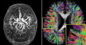5.0T超高場高分辨成像效果(左:血管成像;右:腦神經(jīng)纖維束成像)