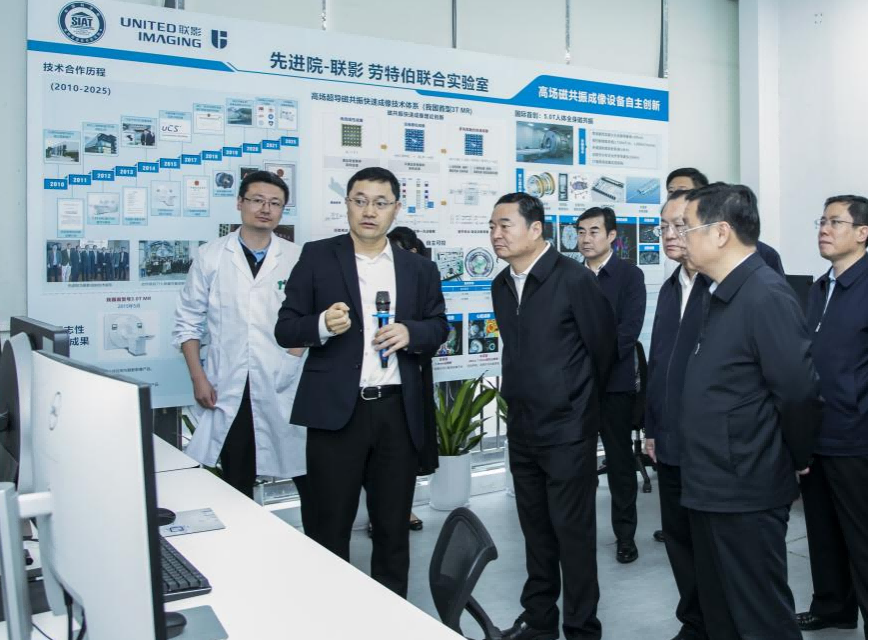 隨后,代表團一行實地參觀了深圳先進院展廳及深圳先進院醫(yī)學(xué)成像科學(xué)與技術(shù)系統(tǒng)重點實驗室,在展廳和實驗室詳細了解深圳先進院在醫(yī)療設(shè)備與科學(xué)儀器、生命健康與合成生物、先進電子與能源材料等關(guān)鍵技術(shù)上取得的科研進展。