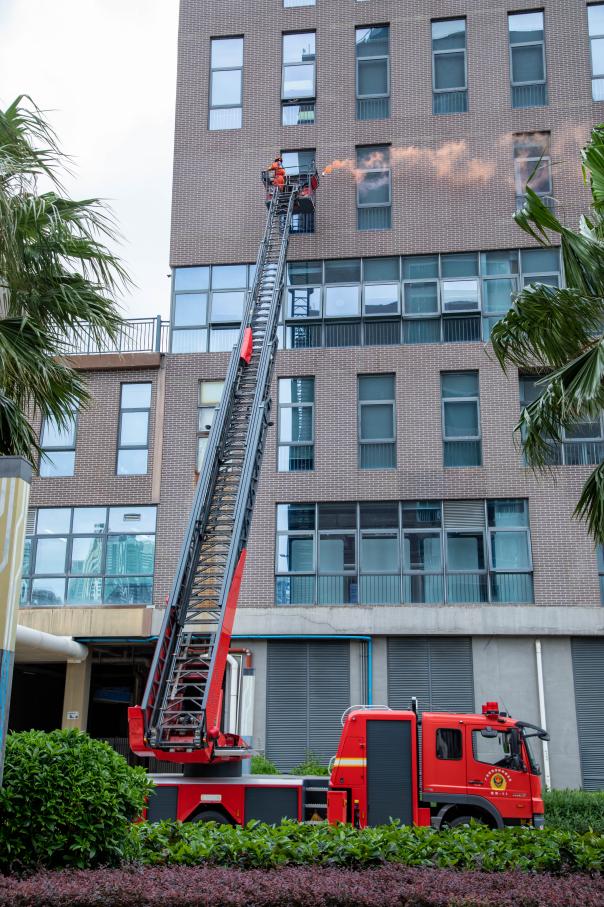 本次活動由模擬樓宇初期火災(zāi)逃生、云梯車營救、水槍滅火、滑繩自救、反恐防暴處置等科目,以及滅火器使用、火災(zāi)黑屋逃生體驗等多個環(huán)節(jié)組成。