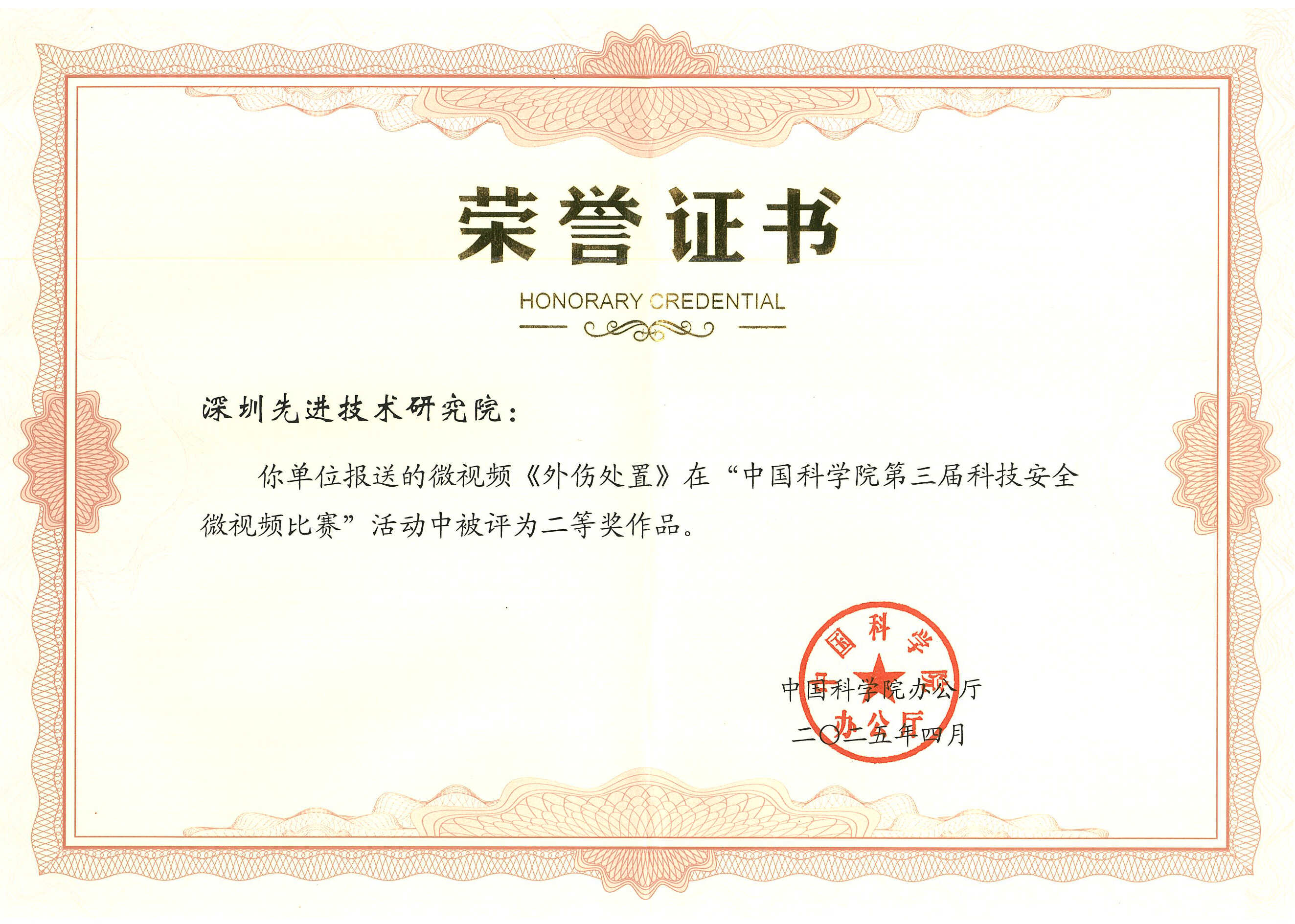 中國(guó)科學(xué)院深圳先進(jìn)技術(shù)研究院榮獲“中國(guó)科學(xué)院第三屆科技安全微視頻大賽二等獎(jiǎng)”