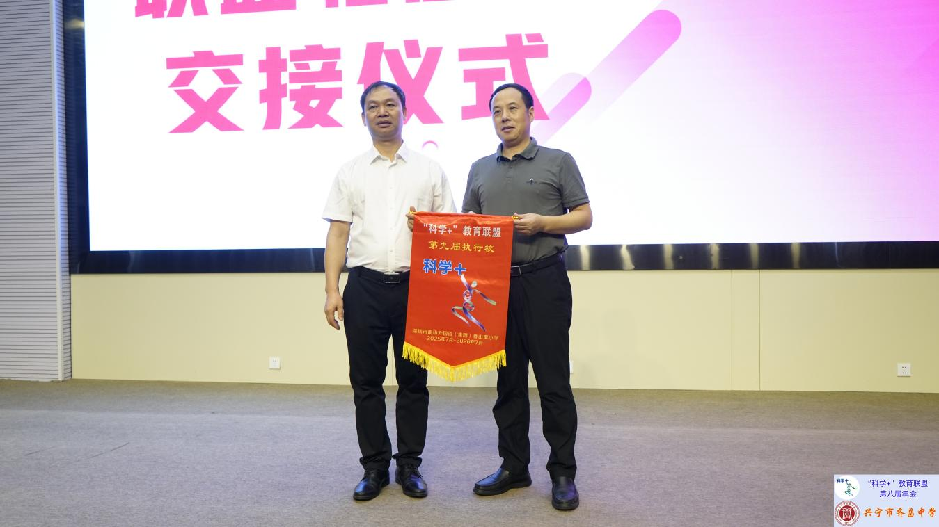 開(kāi)幕式上,“科學(xué)+”教育聯(lián)盟梅州分盟正式成立并迎來(lái)了 8 所新成員校加入,至此興寧市成員??倲?shù)達(dá)到12所,充分展現(xiàn)了區(qū)域科學(xué)教育生態(tài)的蓬勃生機(jī)與強(qiáng)大凝聚力,也標(biāo)志著梅州地區(qū)科學(xué)教育資源整合與協(xié)同發(fā)展步入了系統(tǒng)化、組織化的新階段。興寧市齊昌中學(xué)將聯(lián)盟輪值校接力棒交予深圳市南山外國(guó)語(yǔ)(集團(tuán))香山里小學(xué),聯(lián)盟的發(fā)展動(dòng)能持續(xù)傳遞。
