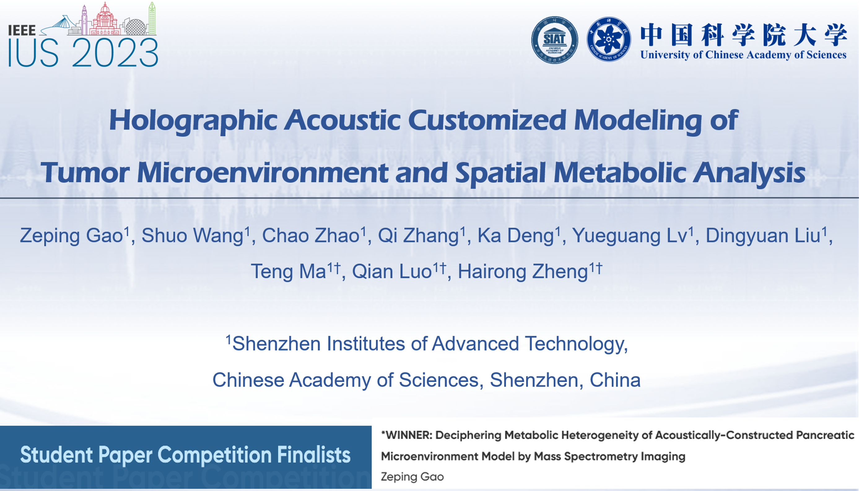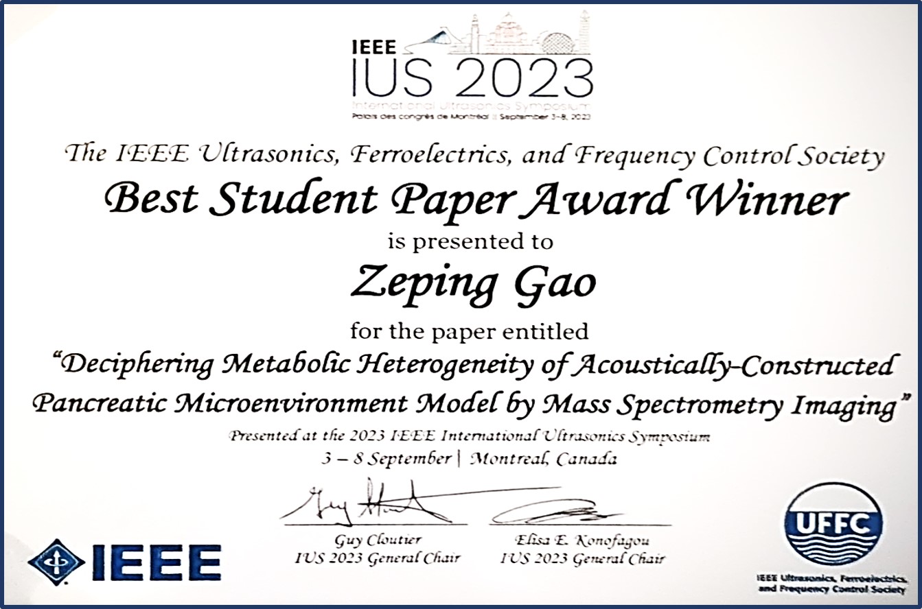獲獎(jiǎng)?wù)撐囊?i>Deciphering Metabolic Heterogeneity of Acoustically-Constructed Pancreatic Cancer Microenvironment Model by Mass Spectrometry Imaging(胰腺癌微環(huán)境模型的全息聲學(xué)構(gòu)建與代謝異質(zhì)性解讀)為題,由深圳先進(jìn)超聲團(tuán)隊(duì)以及質(zhì)譜成像團(tuán)隊(duì)共同完成,深圳先進(jìn)院國(guó)科大碩士生高澤平為論文和本研究的主要作者以及匯報(bào)人。