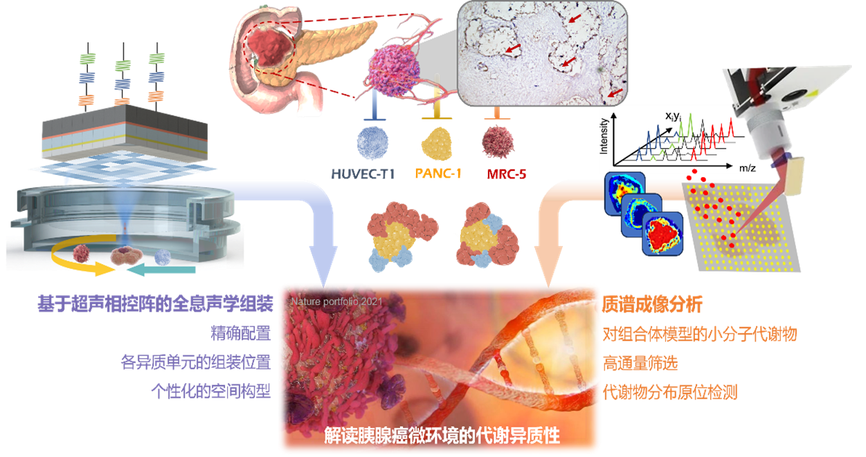 該研究首次將全息聲鑷科研儀器與組織工程中復(fù)雜模型構(gòu)建的需求相結(jié)合,以超聲相控陣對(duì)全息聲場(chǎng)的動(dòng)態(tài)構(gòu)建為基礎(chǔ),設(shè)計(jì)開發(fā)了一系列聲學(xué)組裝策略,實(shí)現(xiàn)了對(duì)細(xì)胞球、類器官的精準(zhǔn)選擇、位置移動(dòng)、旋轉(zhuǎn)對(duì)準(zhǔn)、裝配、夾緊等操作,并構(gòu)建出了具有能夠模擬腫瘤及其微環(huán)境的裝配體模型。此外,研究結(jié)合質(zhì)譜成像技術(shù)進(jìn)一步構(gòu)建出裝配體的代謝全譜圖,為腫瘤代謝異質(zhì)性研究提供了精準(zhǔn)的物質(zhì)分子定性、定量和空間定位信息,同時(shí)為探索組織功能發(fā)展機(jī)制、疾病的發(fā)展過程提供新的視角與手段。