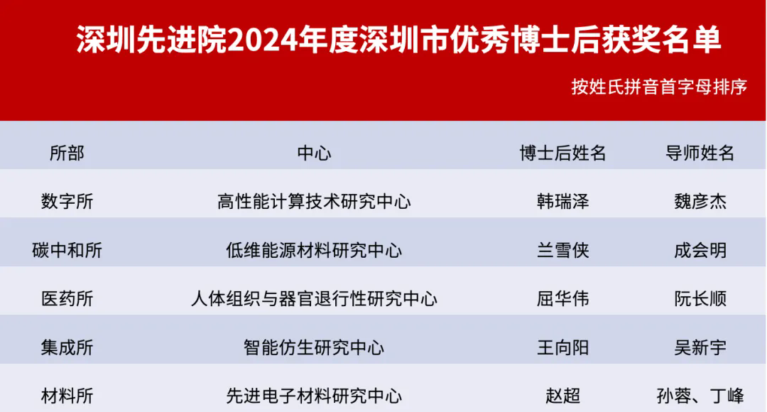 同時,深圳先進院韓瑞澤等5名博士后被評為2024年度深圳市優(yōu)秀博士后,教育處易丹被評為2024年度深圳市優(yōu)秀博士后管理人員。