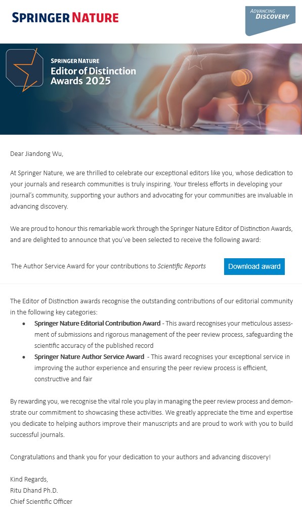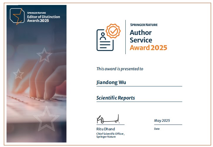 中國(guó)科學(xué)院深圳先進(jìn)技術(shù)研究院醫(yī)工所傳感中心副研究員巫建東博士榮獲2025施普林格·自然杰出編輯獎(jiǎng)(Springer Nature Editor of Distinction Award 2025)的作者服務(wù)獎(jiǎng)(Springer Nature Author Service Award)!該獎(jiǎng)項(xiàng)旨在表彰其擔(dān)任Scientific Reports編委期間,在維護(hù)同行評(píng)審工作中的高效性、建設(shè)性和公平性以及在提升作者投稿體驗(yàn)方面所作出的突出貢獻(xiàn)!