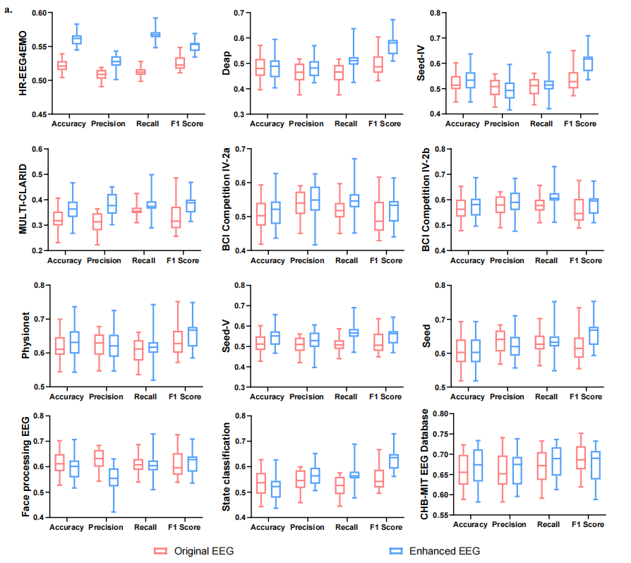 該研究不僅為低成本、低侵入風(fēng)險(xiǎn)的腦機(jī)接口系統(tǒng)開辟了可行路徑,更證明了:在腦機(jī)接口的競(jìng)技場(chǎng)上,生成式AI對(duì)神經(jīng)物理機(jī)制的解析深度,與電極通道數(shù)量同樣關(guān)鍵—甚至可能是更具性價(jià)比的決勝因素。團(tuán)隊(duì)當(dāng)前已在10余項(xiàng)下游任務(wù)上驗(yàn)證得出,重建后的神經(jīng)信號(hào)顯著提升了腦機(jī)接口解碼精度(圖3)。